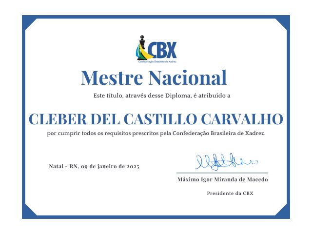 Cleber Del Castillo Carvalho (AP),.recebe o título de Mesetre Nacional, cumpriu todos os requisitos e em breve receberá o diploma e também fará parte da página de Titulados