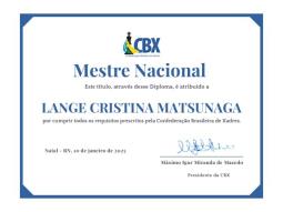 Lange Cristina Matsunaga (GO), recebe o título de Mestre Nacional, cumpriu todos os requisitos e em breve receberá o diploma e também fará parte da página de Titulados