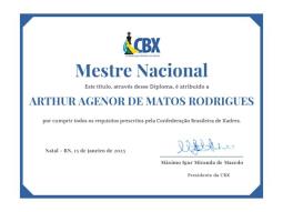 Arthur Agenor de Matos Rodrigues (PE), recebe o título de Mestre Nacional, cumpriu todos os requisitos e em breve receberá o diploma e também fará parte da página de Titulados