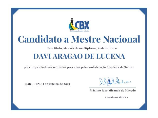 Davi Aragao de Lucena (PA), recebe o título de Candidato a Mestre Nacional, cumpriu todos os requisitos e em breve receberá o diploma e também fará parte da página de Titulados