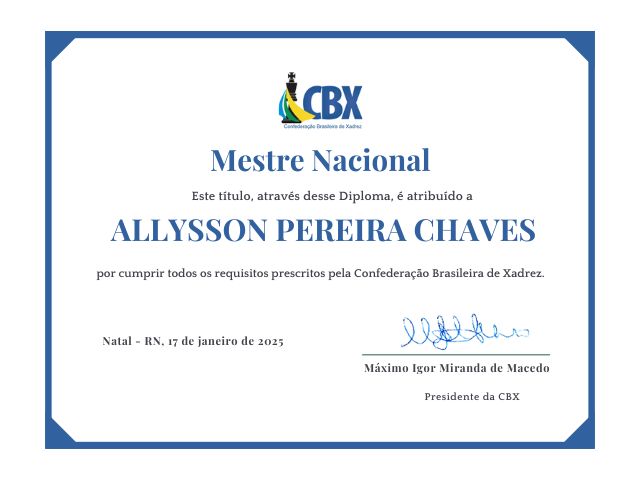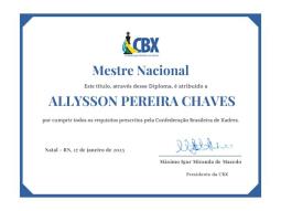 Allysson Pereira Chaves (PA), recebe o título de Mestre Nacional, cumpriu todos os requisitos e em breve receberá o diploma e também fará parte da página de Titulados