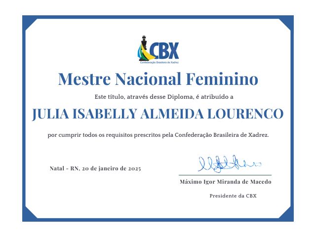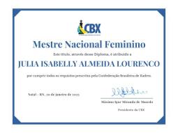Julia Isabelly Almeida Lourenco (PE), recebe o título de Mestre Nacional Feminino, cumpriu todos os requisitos e em breve receberá o diploma e também fará parte da página de Titulados
