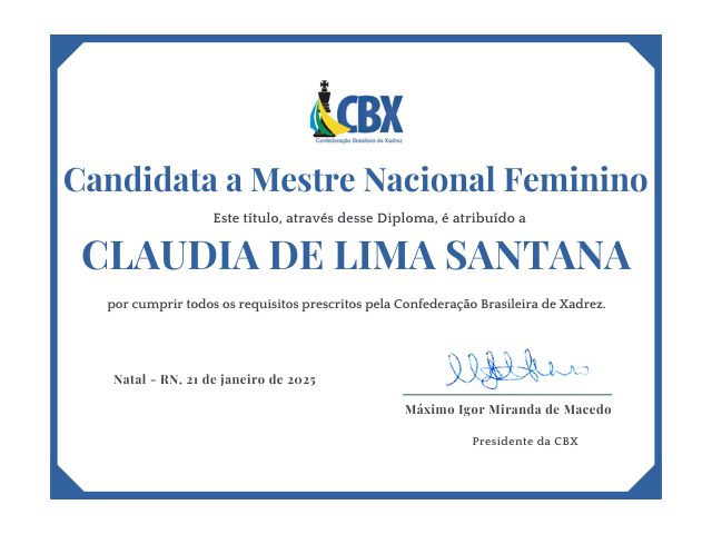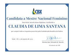 Claudia De Lima Santana (BA), recebe o título de Candidata a Mestre Nacional Feminino, cumpriu todos os requisitos e em breve receberá o diploma e também fará parte da página de Titulados