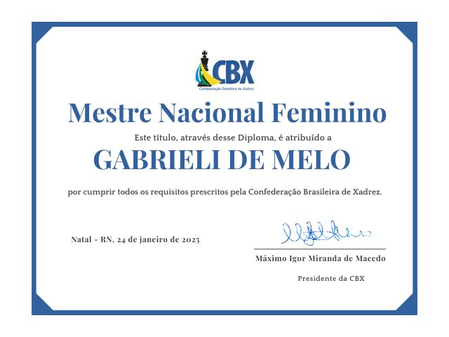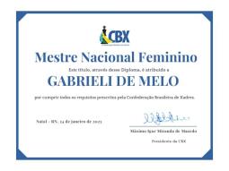 Gabrieli de Melo (PR), recebe o título de Mestre Nacional Feminino, cumpriu todos os requisitos e em breve receberá o diploma e também fará parte da página de Titulados