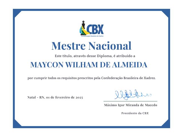 Maycon Wilham de Almeida (MG), recebe o título de Mestre Nacional, cumpriu todos os requisitos e em breve receberá o diploma e também fará parte da página de Titulados
