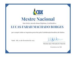 Lucas Farah Machado Borges (GO), recebe o título de Mestre Nacional, cumpriu todos os requisitos e em breve receberá o diploma e também fará parte da página de Titulados